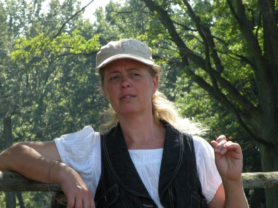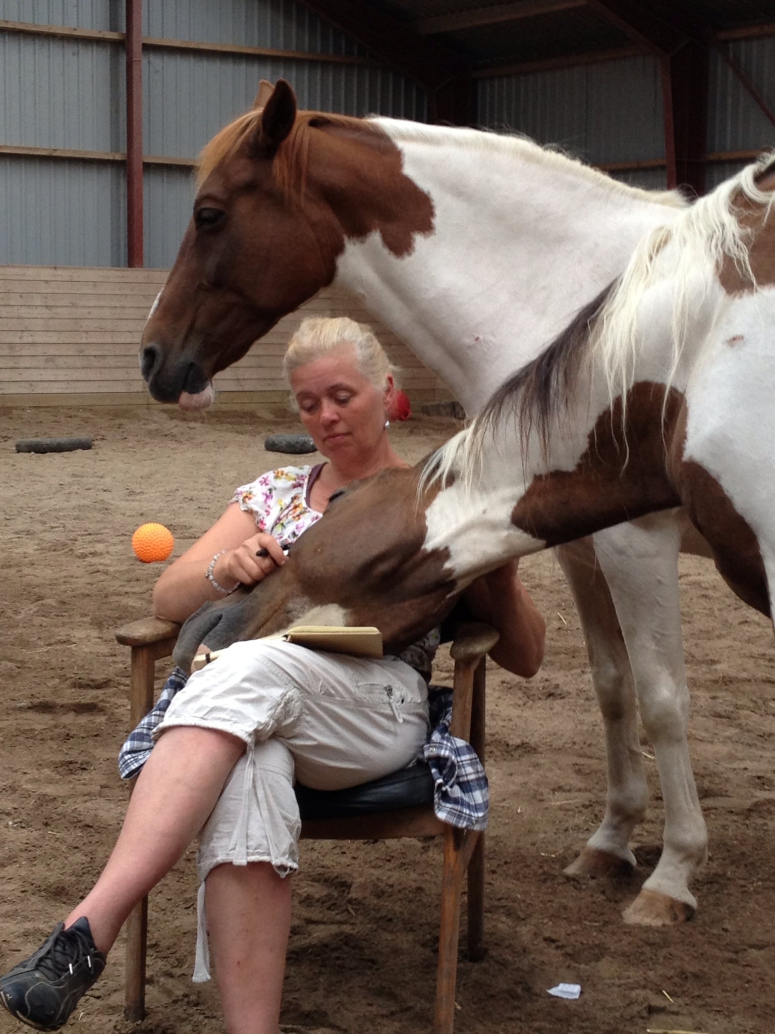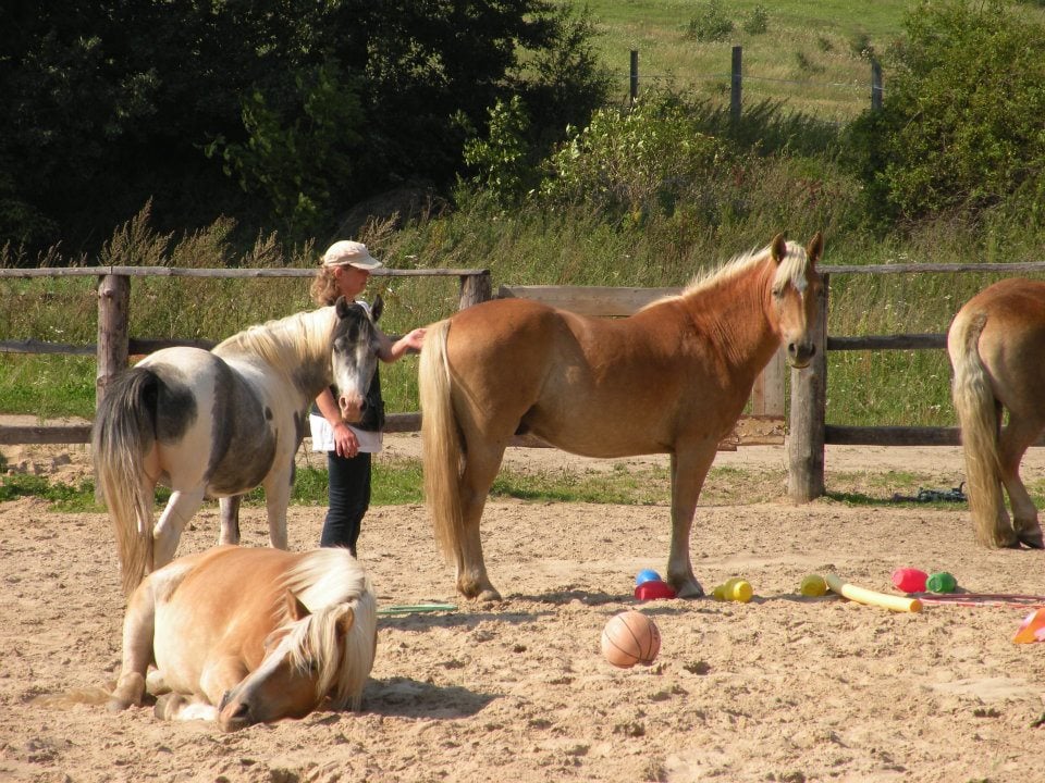 Der er en hest der har lagt sit hoved i hendes skød, og der står en hest bagved kvinden.